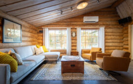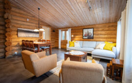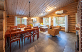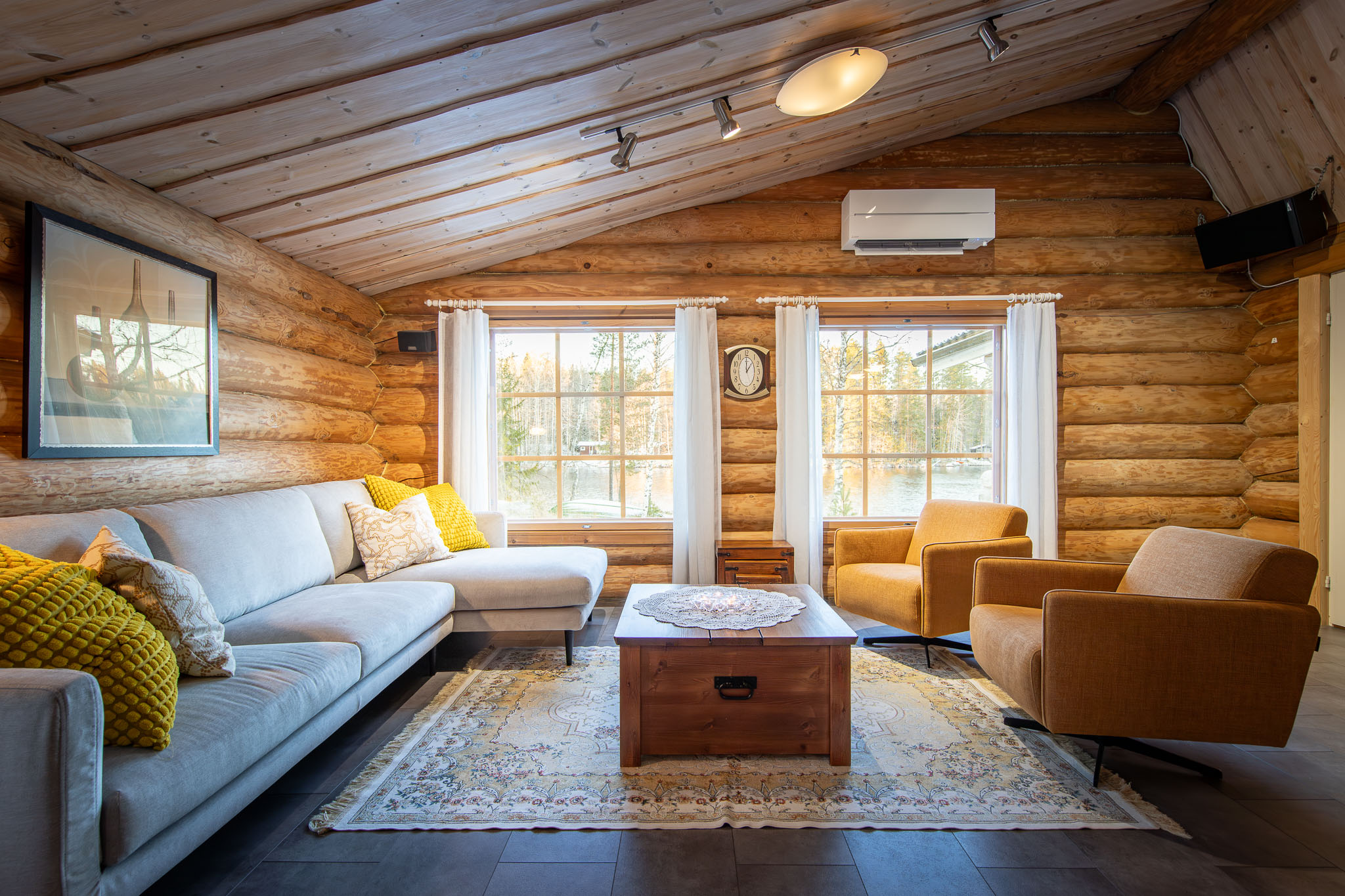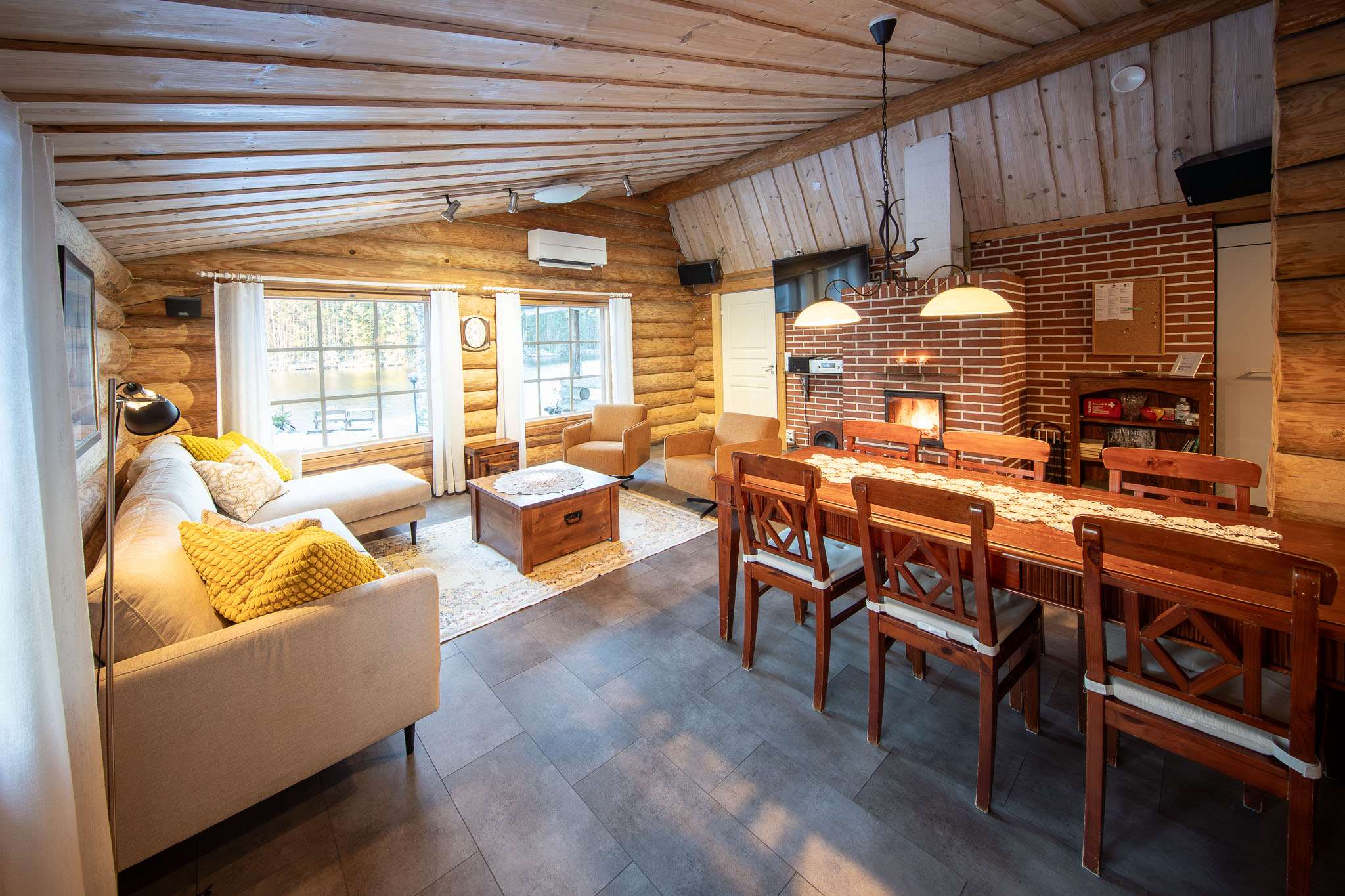 Upea hirsimökki aurinkoisella nurmipihalla. Hiidenkivi tarjoaa erinomaiset tilat neljälle hengelle tai oikean luksusloman kahdelle! Mökissä on vesikiertoinen lattialämmitys ja maalämpö.