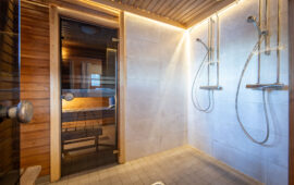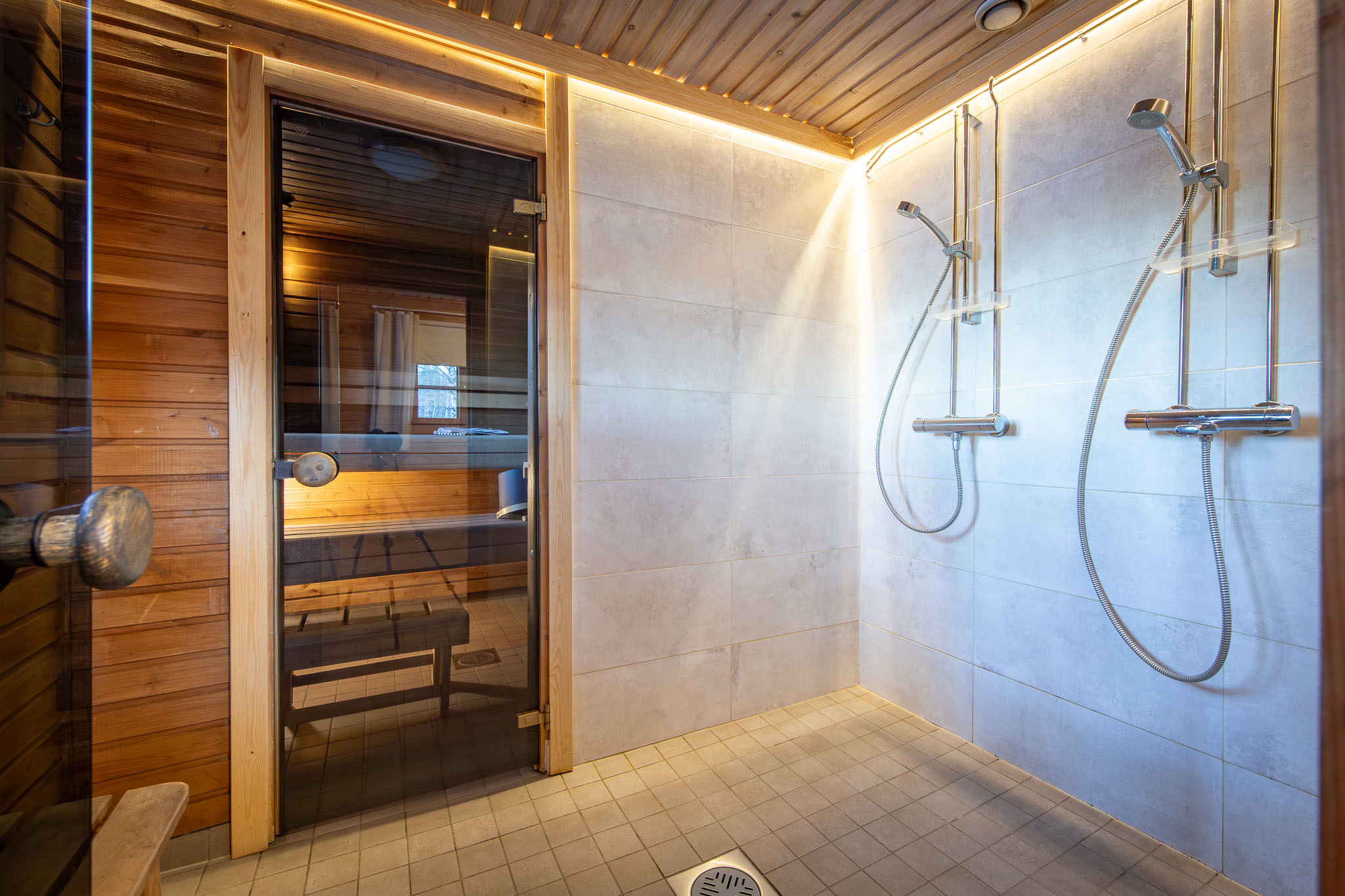 Hiidenkivessä on vesikiertoinen lattialämmitys kaikissa tiloissa. Eteisessä, WC:ssä ja saunaosastolla laattalattia, muissa tiloissa vinyylilankkulattia. Mökin puulämmitteiseen saunaan mahtuu mukavasti neljä saunojaa kerrallaan. Pukuhuoneesta käynti verannalle vilvoittelemaan. Kylpyhuonessa kaksi suihkua. Lisäksi mökissä koneellinen ilmanvaihto lämmöntalteenotolla sekä ilmalämpöpumppu viilennystä varten. Talotekniikka on sijoitettu siististi WC-tilaan, jossa myös kuivaava pyykinpesukone.